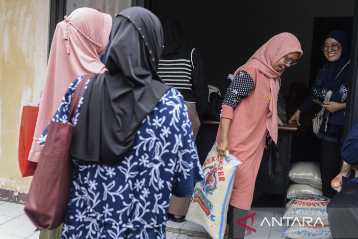 Warga membawa beras bantuan saat penyaluran bantuan sosial beras di Kecamatan Walantaka, Kota Serang, Banten, Kamis (18/9/2025). Kementerian Sosial (Kemensos) mencatat penyaluran bantuan sosial (bansos), salah satunya seperti sembako atau Bantuan Pangan Non-Tunai (BPNT) pada triwulan ketiga tahun 2025 sudah menyasar 13,6 juta penerima manfaat. ANTARA FOTO/Muhammad Bagus Khoirunas/gp