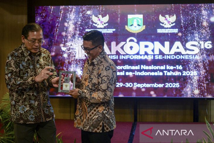 Ketua Komisi Informasi Pusat Donny Yoesgiantoro (kiri) menyerahkan plakat kepada Gubernur Banten Andra Soni (kanan) saat pembukaan Rapat Koordinasi Nasional (Rakornas) ke-16 Komisi Informasi se-Indonesia di Kota Tangerang, Banten, Senin (29/9/2025). Rakornas bertema Penguatan Keterbukaan Informasi Publik dalam Memperkokoh Ketahanan Nasional tersebut untuk memperkuat sinergi Komisi Informasi se-Indonesia dalam mewujudkan pemerintahan yang transparan, akuntabel, serta meningkatkan kualitas pelayanan informasi publik di setiap daerah. ANTARA FOTO/Putra M. Akbar/gp