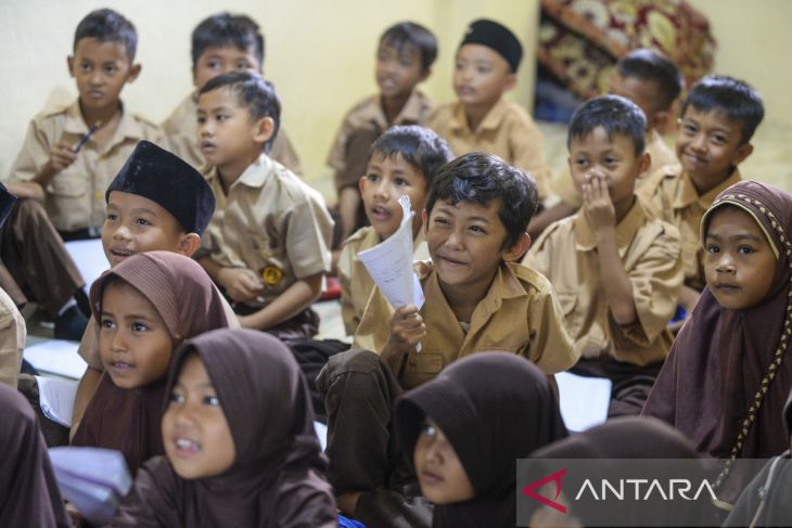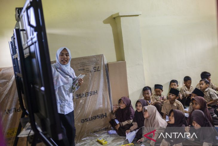 Sejumlah siswa kelas dua mengikuti pembelajaran melalui papan interaktif atau layar digital pintar (Interactive Flat Panel) di SD Negeri Panunggulan 2, Kabupaten Serang, Banten, Jumat (3/10/2025). Sejumlah sekolah dasar di Kabupaten Serang tersebut mulai menggunakan layar digital pintar yang merupakan program bantuan Pemerintah Pusat sebagai upaya mengatasi kesenjangan dalam penyelenggaraan sarana pendidikan baik di daerah perkotaan maupun daerah pelosok. ANTARA FOTO/Muhammad Bagus Khoirunas/gp