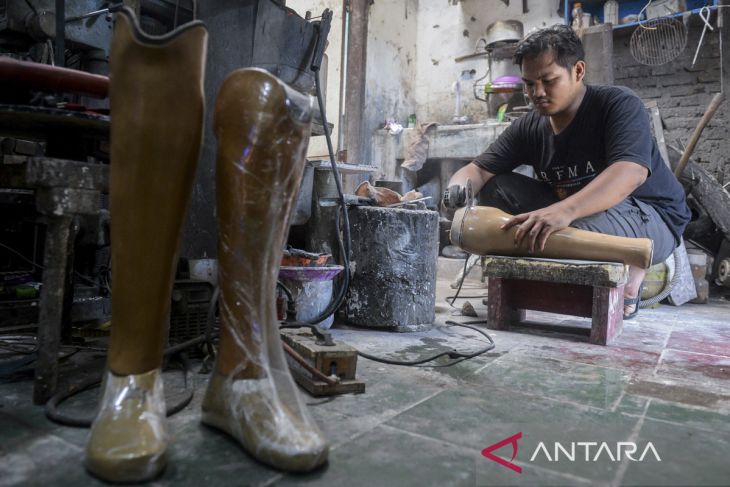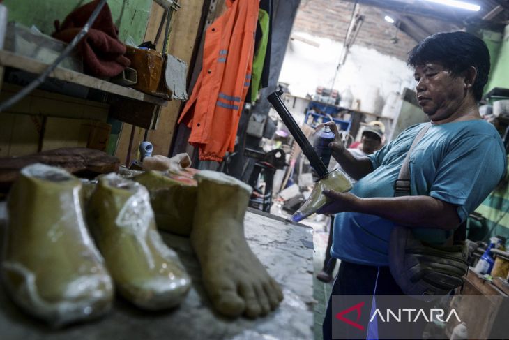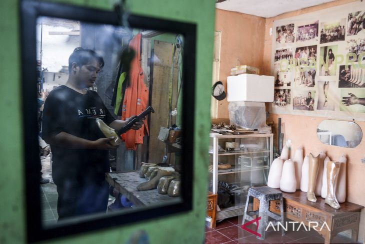 Pekerja menyelesaikan pembuatan kaki palsu di Sanggar Organ Prosthetic Ali Saga, Neglasari, Kota Tangerang, Banten, Sabtu (25/10/2025). Produksi kaki palsu berbahan resin fiber untuk penyandang tunadaksa tersebut dijual dari harga Rp7,5 juta - Rp18 juta per unit dengan proses pengerjaan selama satu minggu. ANTARA FOTO/Putra M. Akbar/gp