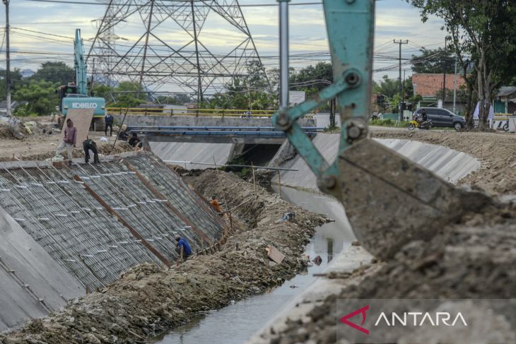 Sejumlah pekerja menyelesaikan normalisasi kali Cibanten di Kasemen, Kota Serang, Banten, Senin (17/11/2025). Pemerintah Provinsi Banten melakukan normalisasi sungai Cibanten sepanjang 1,9 km di sungai utama dan 1,5 km di kali pembuang sebagai upaya pengendalian banjir serta memperkuat irigasi pertanian yang ditargetkan selesai pada Desember 2025. ANTARA FOTO/Muhammad Bagus Khoirunas/gp