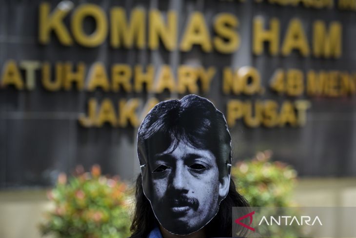 Aktivis mengenakan topeng tokoh HAM Munir Said Thalib saat Aksi 21 Tahun Kasus Munir di depan kantor Komnas HAM, Jakarta, Senin (8/12/2025). Mereka mendesak Komnas HAM untuk segera menuntaskan kasus Munir dan menetapkannya sebagai kasus pelanggaran berat HAM. ANTARA FOTO/Putra M. Akbar/gp
