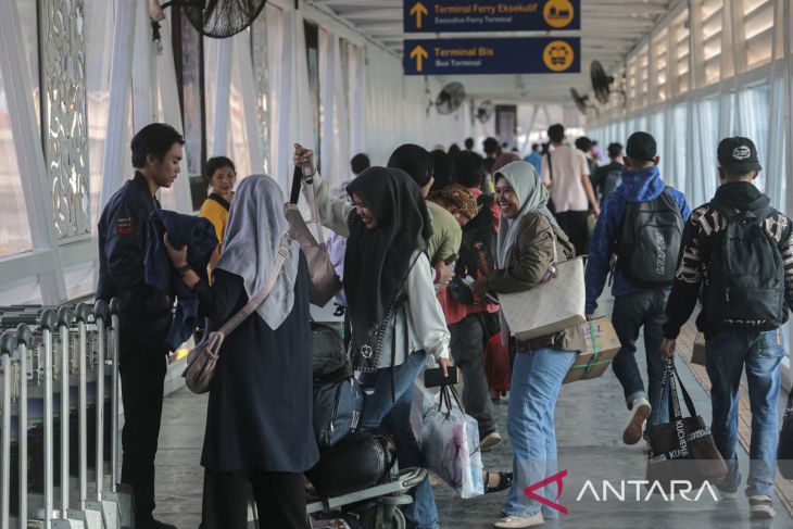 Penumpang kapal menggunakan troli untuk membawa barang bawaan mereka setibanya di Pelabuhan Merak, Kota Cilegon, Banten, Selasa (23/12/2025). Berdasarkan data posko Merak periode 22 Desember 2025 selama 24 jam, total penumpang yang menyeberang dari Jawa ke Sumatera melalui Pelabuhan Merak, Ciwandan, dan Bandar Bakau Jaya pada H-3 Natal mencapai 32.533 orang, sementara total kendaraan yang telah menyeberang sebanyak 7.131 unit. ANTARA FOTO/Angga Budhiyanto/gp