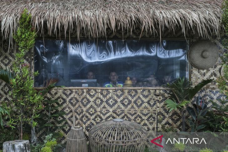 Polisi memantau layar yang menampilkan data dan arus lalu lintas melalui CCTV di pos pelayanan Natal 2025 dan Tahun Baru 2026 bertema rumah adat Badui di Cikande, Kabupaten Serang, Banten, Jumat (26/12/2025). Polres Serang mendirikan pos pelayanan tersebut yang dilengkapi dengan sejumlah fasilitas di antaranya ruang istirahat, ruang pemantauan lalu lintas, layanan cek kesehatan, area bermain anak, dan servis motor gratis guna mendukung kelancaran serta kenyamanan masyarakat selama libur Natal dan Tahun Baru. ANTARA FOTO/Angga Budhiyanto/gp